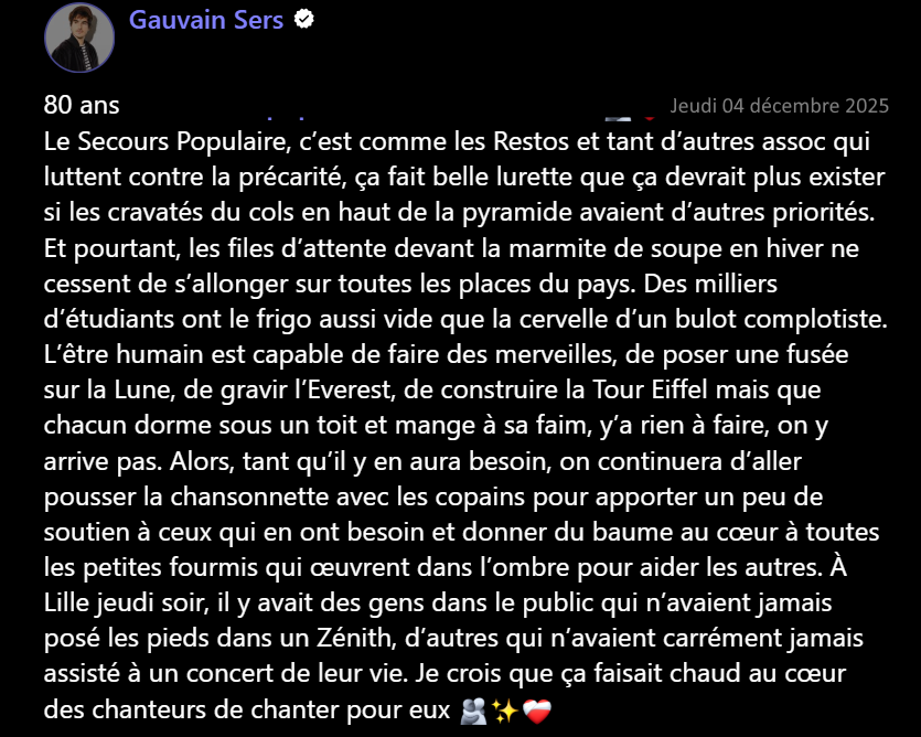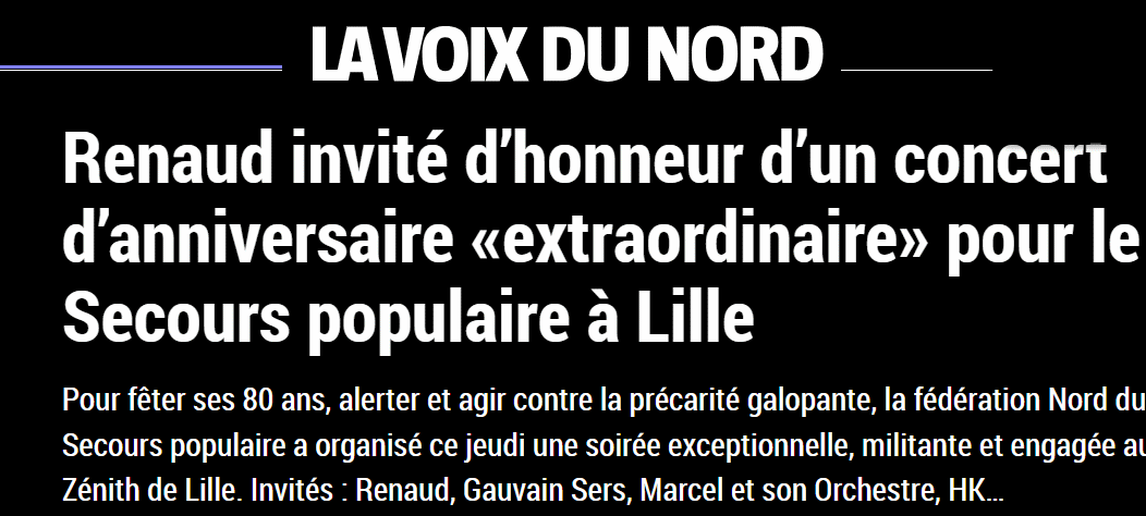 Frédo Sansnom (Facebook) Hier soir c'était concert pour les 80 ans du Secours populaire au zénith de Lille... J'y étais !! Avec mon camarade Serge Piens, nous avons passé une soirée qui restera mémorable... Quel concert !! Plein d'artistes pour un somptueux plateau !! Picon mon amour, Mathilde, Noé Preszow, La rue Ketanou, Les ogres de Barback, Marcel et son orchestre, HK et les saltimbanques, Gauvain Sers et Renaud !! On en veut encore, et pour le secours populaire et ce concert militant, "on lâche rien" ! **********